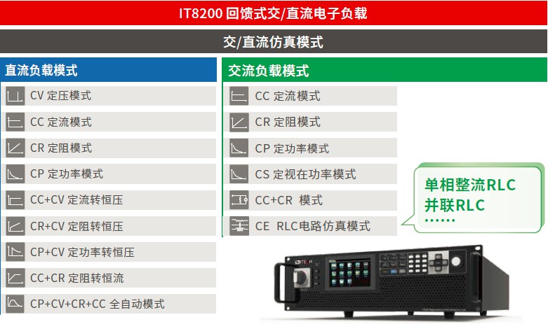 IT8200系列是一款回馈式的可编程交/直流电子负载,采用碳化硅(SiC)技术,高效的回馈能力可以将电能无污染的回馈电网,节省用电和散热成本的同时也符合节能环保的需求。AC模式下同时支持整流和非整流,提供了CC/CR/CP/CS/CC+CR/CE等多种操作模式,其中CE模式可以模拟单相整流RLC和并联RLC等多种电路拓扑。IT8200可以广泛应用于电动车对电网测试V2G、电动车充电站EVSE、逆变器Inverter、储能变流器PCS、不断电系统UPS等多个领域。 IT8200系列采用高功率密度设计,在2U的体积内功率可达6kVA,在3U的体积内功率可15kVA,通过主从并机,可轻松扩展功率至960kVA。用户通过触摸屏设计的图形化界面可以直接定义不同波形,结合任意波形编辑功能和完善的保护功能,是研发、测试、系统搭建的理想选择。