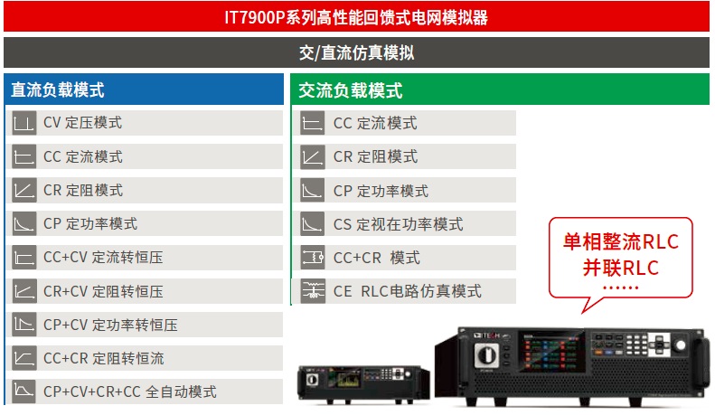 IT7900P系列融合了3个设备,用户可以直接在仪器面板上选择将IT7900P当做一台IT7900电网模拟器使用,并且拥有可编程交流电源IT7800的全部功能,也可以选择当做一台回馈式交/直流负载IT8200使用。