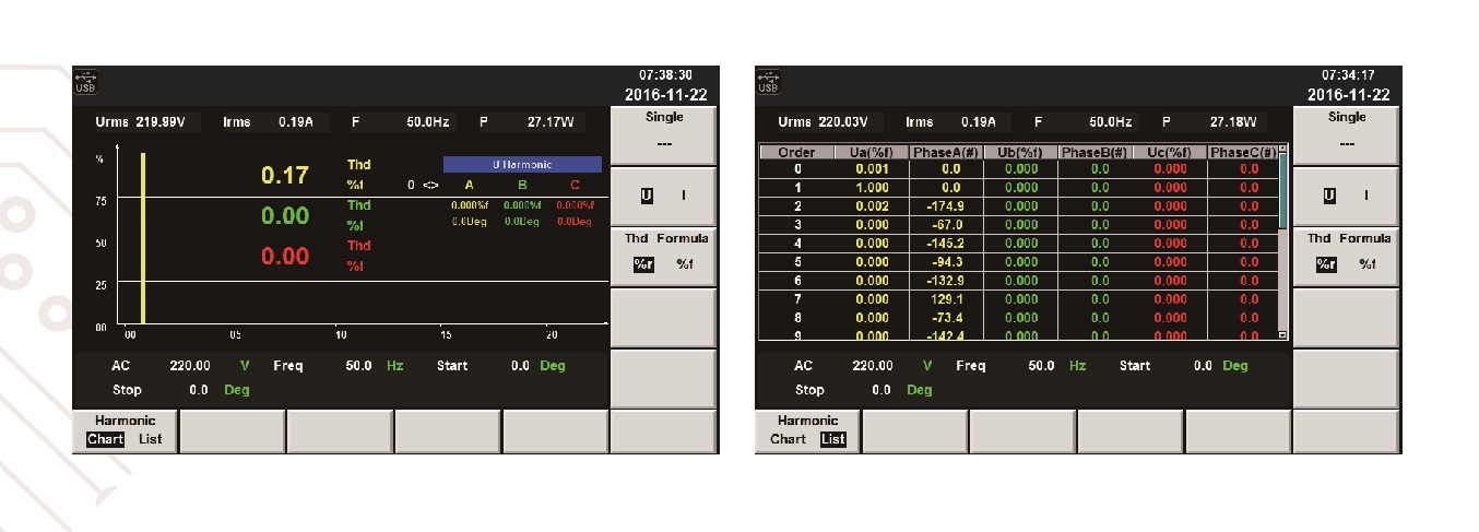 IT7600系列拥有谐波分析功能,包括电压谐波测量和电流谐波测量。10-500Hz频率范围内,可以测量50次电压和电流谐波;500Hz频率以上,可以测量20次电压和电流谐波。在谐波模式下可实现电压和电流谐波失真因数(U/I THD)和相位的测试。此外还可进行多次谐波测量,结果以列表或柱状图的方式显示,使测试结果分析更加一目了然。