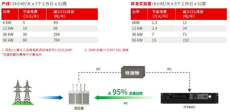 IT-M3900C具有能量回收功能,可以将电能无污染的回馈电网,回馈近95%。所有的回馈过程都是自动且安全的,IT-M3900C配备了自动电网检测系统,实时检测相电压、频率用于电网同步。不但可以节省电力、暖通空调和制冷设施的成本,减少噪音,而且有助于减少碳排放,保护环境。