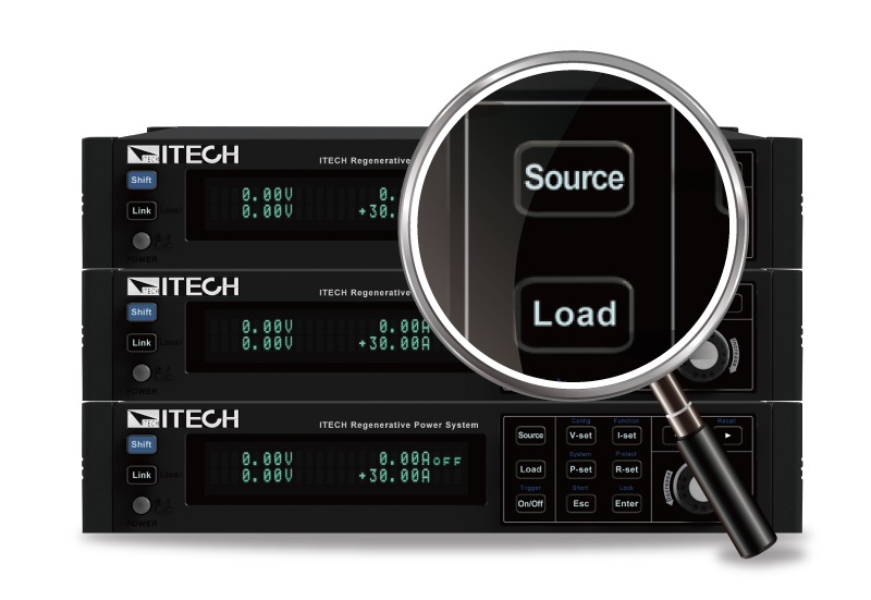 IT-M3600很好的将两种设备集合在了½U的小巧体积中,不仅可以当高性能的双向直流电源运行;也可以当回馈载操作,模拟各种负载特性,并将电能无污染的回馈电网,一机多用。用户无需通过软件以及任何终端设备,一键即可切换操作模式,避免了在连接设备及操作软件时花费过多时间,同时也大大的节省了空间和成本。
