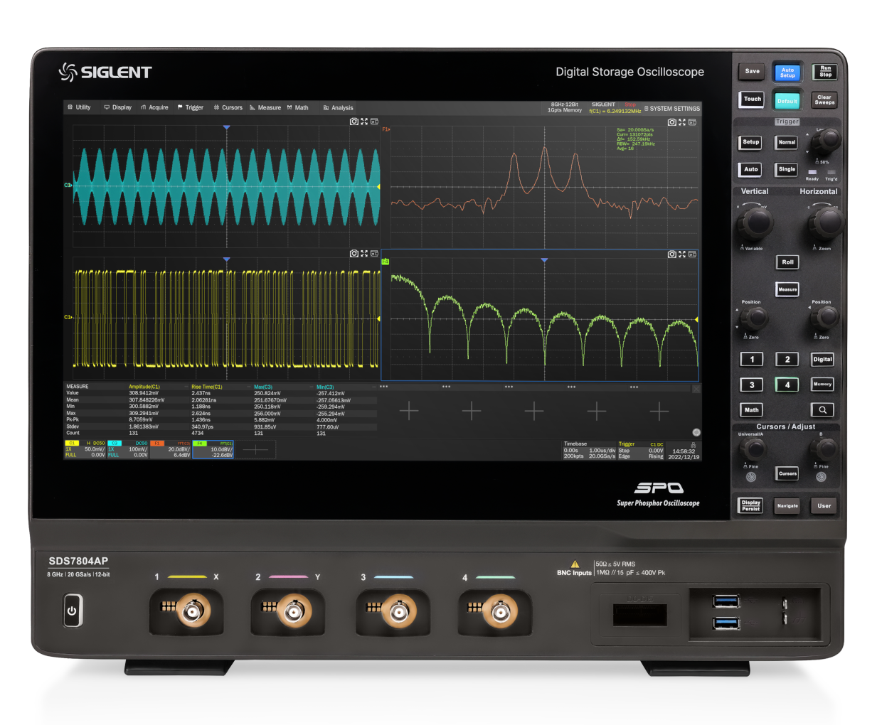 SDS7000A系列作为鼎阳科技新旗舰示波器产品,最高带宽提升至8GHz,上升时间仅为58ps,比4GHz带宽的示波器快了一倍以上,能支持测量MIPI-DPHY、DDR2/DDR3、USB2.0、2.5/5/10GBASE-T等信号,应用场景更加丰富;同时采用了全新15.6英寸高清触摸屏,支持分屏显示功能,带来全新的测量体验。