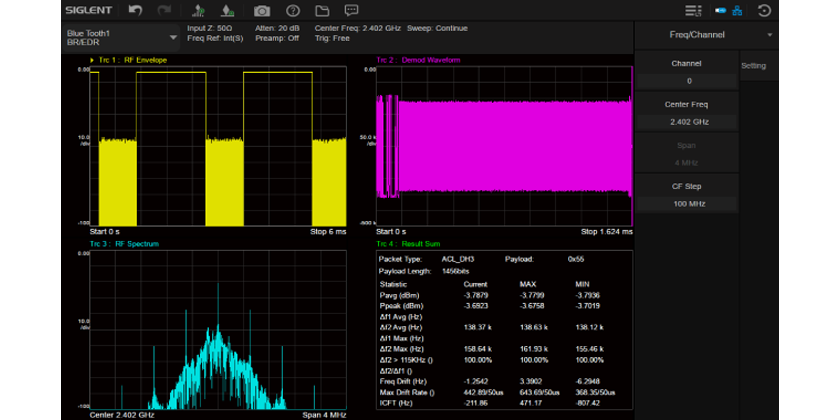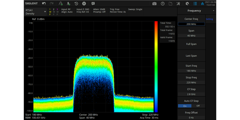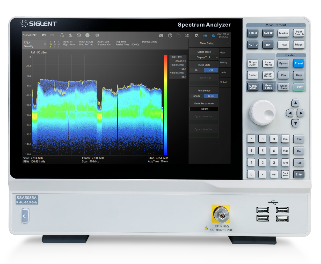 频谱分析频率范围:9 kHz – 26.5 GHz 实时分析带宽 40 MHz(Real-Time Analysis) 显示平均噪声电平 DANL 低于 -165 dBm/Hz 相位噪声低于 -105 dBc/Hz@1 GHz,偏移 10 kHz(典型值) 最小分辨率带宽(RBW)1 Hz 信号调制分析支持AM/FM,ASK/FSK/MSK/PSK/QAM 等主要特性