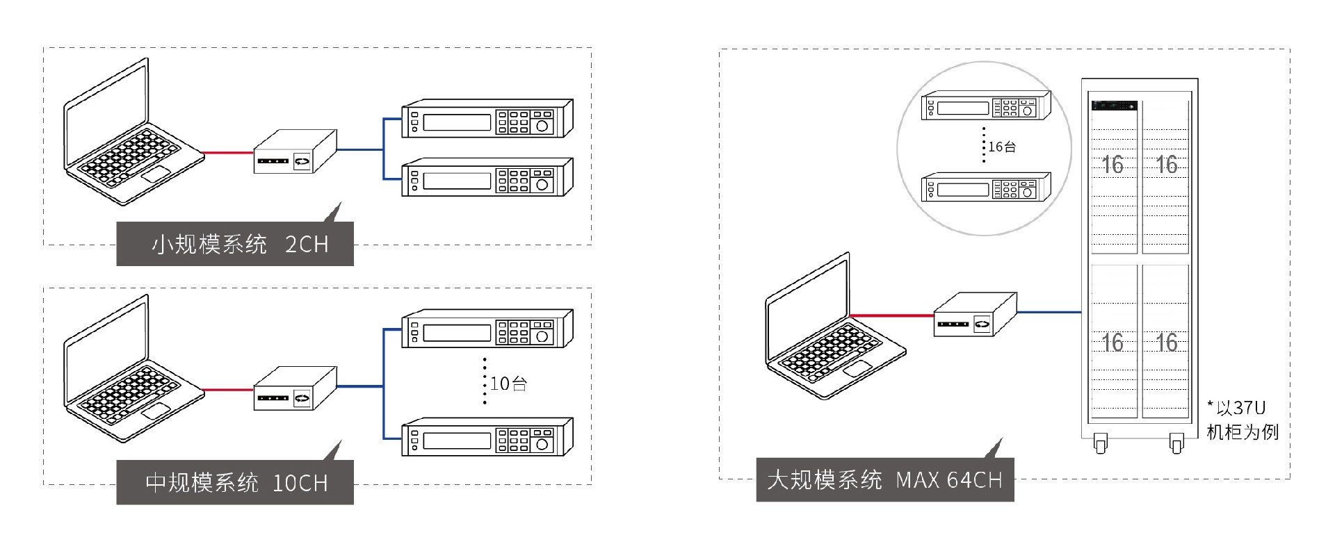 IT-M3300具备灵活的多通道的设计架构,用户可将多台IT-M3600组成多通道源载系统,每台仪器界面都会显示通道号。将其中一台电源的通讯接口与PC端连接,就可在上位机软件中独立控制系统中的每台电源,每个通道可完全独立操作。