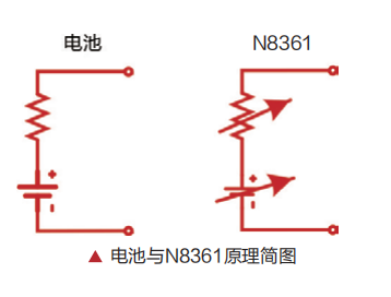 N8361系列具备电池内阻模拟功能,并支持内阻值可编程,可编程范围为:0-20Ω,可模拟与真实电池内阻特性一致的变化曲线。N8361与电池在原理上如图所示: