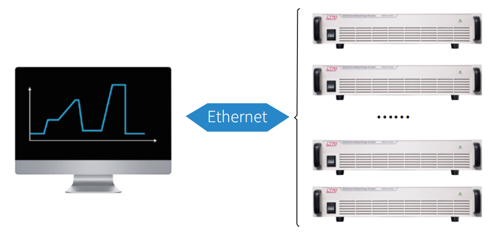 当需要多串电池芯时,可多台电池模拟器多通道串联使用,使用者亦可透过Ethernet标准界面进行远端控制及其他自动测试应用。多通道批量操作功能,各通道亦可分别显示数据及曲线图表,并提供数据分析与报表功能。