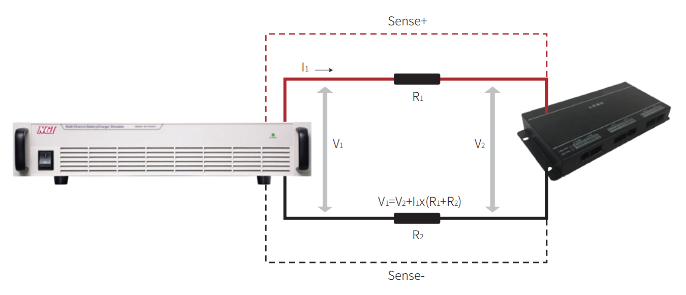 为了保证对被测设备提供精确的电压,N8330系列产品采用四线制接法,即两线用于输出电压,另外两端直接测量 被 测 设 备 电 压 。通 过 S E N S E 端 测 量 线 能 消 除 电 源 到DUT之间因引线电阻而引起的电压降。